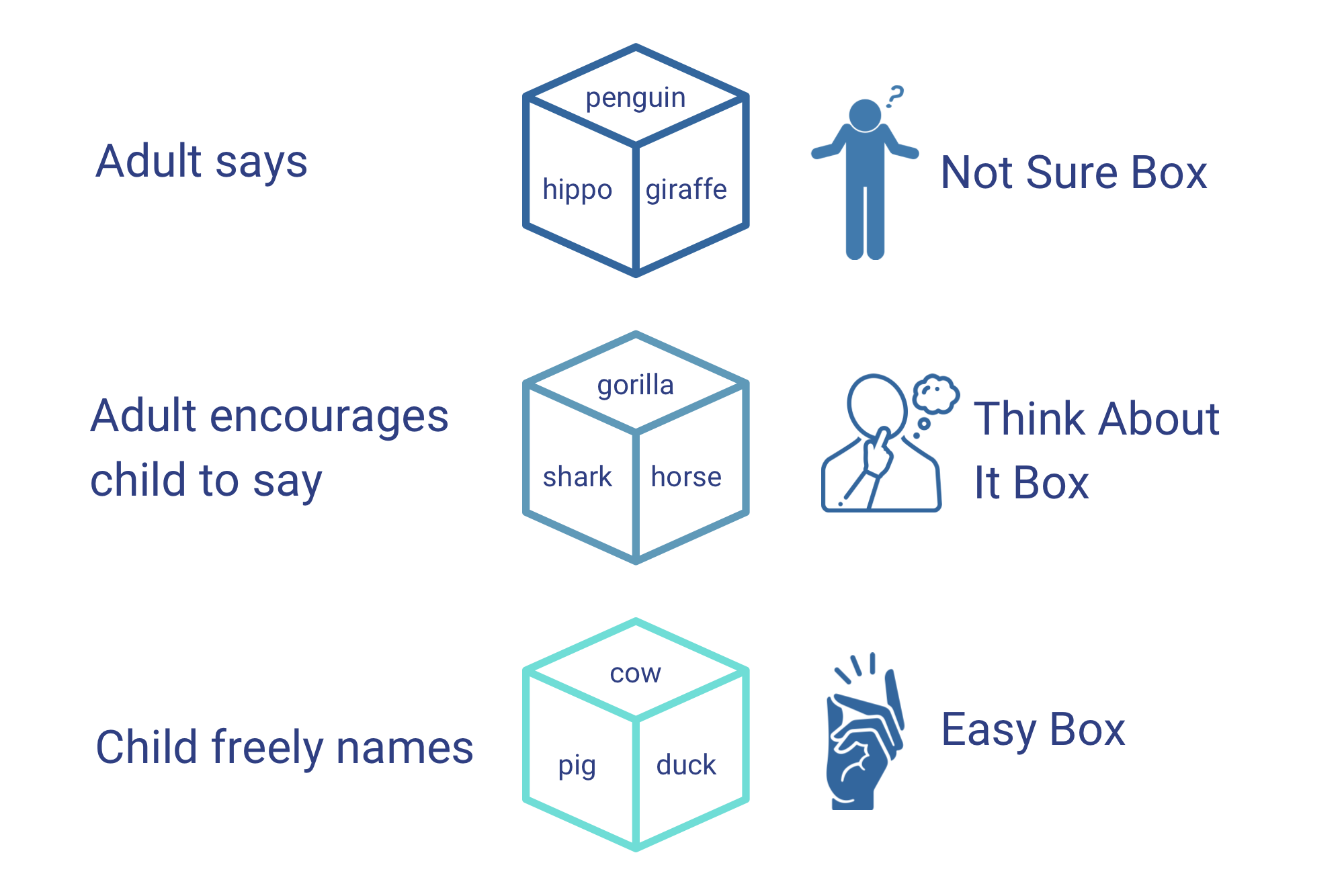 Adult says > giraffe, hippo, penguin = these words might be in the child's not sure box so they need to hear them over and over again